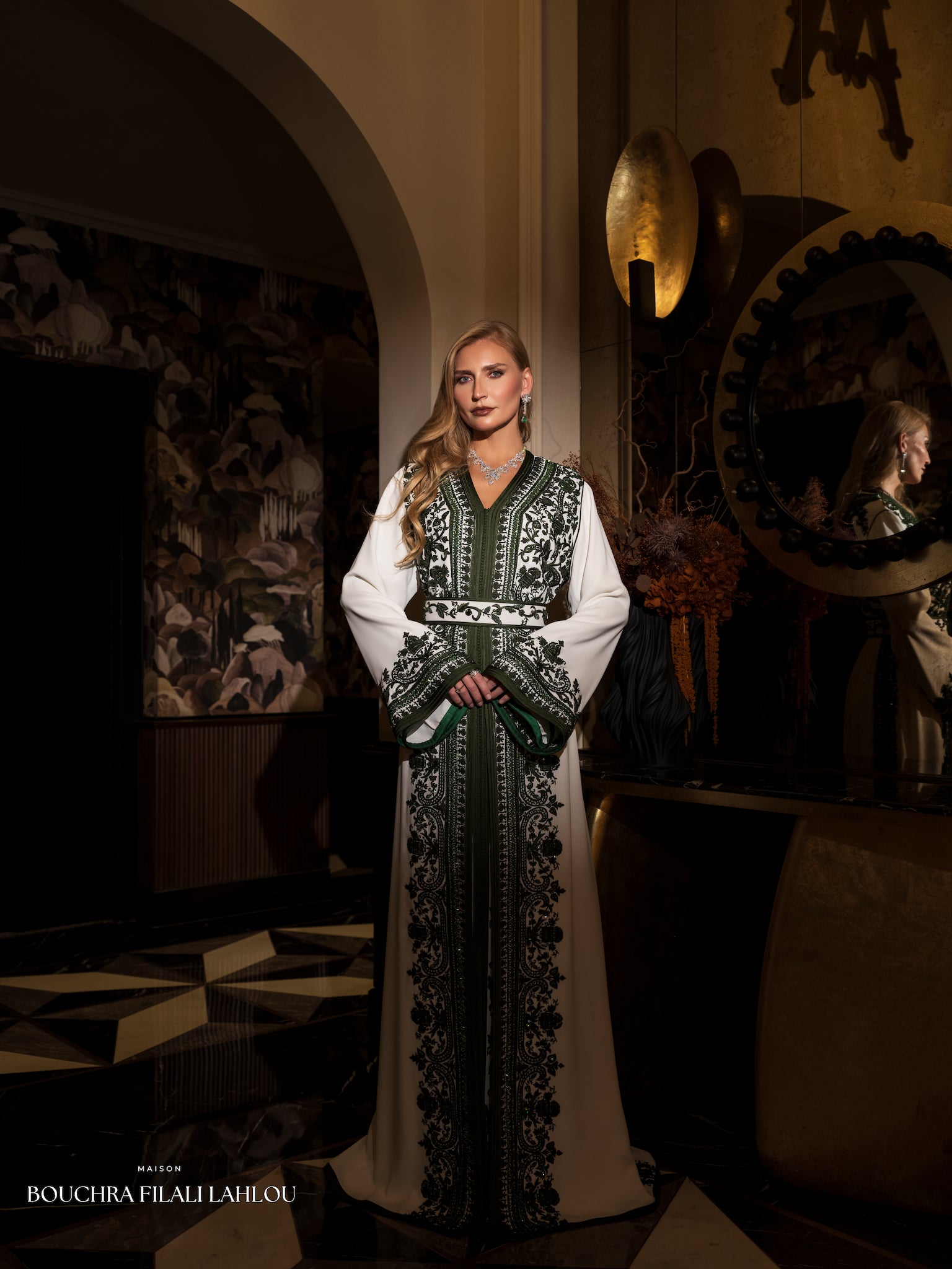 Emerald Nocturne is a tribute to Moroccan elegance after dusk. Crafted in luminous ivory and adorned with deep emerald embroidery, this caftan reveals a powerful contrast between light and shadow.